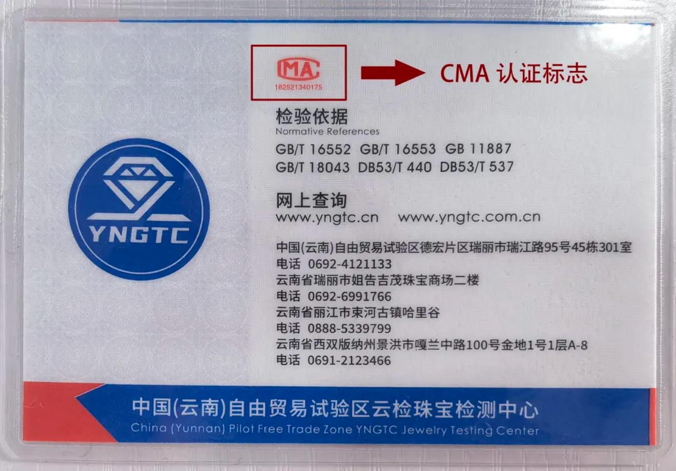 星空娱乐是根据《中华人民共和国计量法》、《中华人民共和国标准化法》、《中华人民共和国产品质量法》、《检验检测机构管理办法》等有关规定,通过了云南省市场监管局的检验检测机构资质认定评审,取得资质证书,主要开展珠宝玉石及贵金属检验检测工作的第三方公正机构,中心所出具数据(证书和报告)具备法律效力并承担相应的责任。星空娱乐出具的证书上有明显的CMA认证标志。